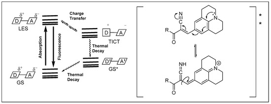 Molecular rotors are conditionally fluorescent compounds, which contain two or more chromophores in a push–pull configuration. When the chromophores are forced to be aligned parallelly, the compounds fluoresce. If the system is free to rotate, it forms twisted intramolecular charge transfer (TICT) states, the excited state decays thermally, and no fluorescence is observed (Figure 1). These fluorescence characteristics are strongly affected by particular microenvironments [12,13]. Molecular rotors show an enhancement in their fluorescence with increasing viscosity of the surroundings, as well as during binding to protein targets in cells. Compounds with molecular rotor functions, such as α-cyanoacryl-derivatives of julolidine (Figure 1), have been applied as biosensors to determine the viscosity in various cellular microenvironments [14,15,16].