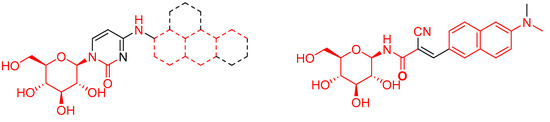 Based on our previous experience with the synthesis of GP N4-arylamine-substituted 1-(β-d-glucopyranosyl)pyrimidin-2-one inhibitors, we set out to design an N-glycoside incorporating a molecular rotor moiety. More specifically, it was decided to use the (E)-2-cyano-3-(6-(dimethylamino)naphthalen-2-yl)acryl-moiety [17,18], which has been shown to exhibit the desired molecular rotor characteristics, attached to a β-d-glucopyranose by means of an amide bond. The proposed aglycon was expected to satisfactorily mimic the structural characteristics of molecules (previously synthesized by our group [9,10,11]) necessary to strongly bind to the catalytic site of rabbit muscle glycogen phosphorylase (RMGP) (Figure 2). Furthermore, use of the dimethylaminonaphthyl-system was expected to lead to compounds with excitation and emission maxima falling within the region of the filter-sets commonly used in fluorescence microscopy for the observation of the mCherry fluorescent protein (450–600 nm for excitation and 600–700 nm for emission) [19]. The same chromophore system has also been utilized as a two-photon fluorescent sensor for near-infrared imaging in whole tissues [17,18].