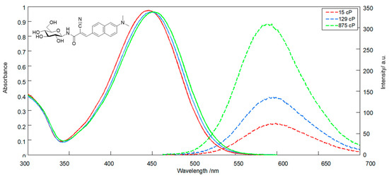 Absorption (left) and emission (right) spectra of (6) in relation to solution viscosity (red: 100% Gl, μ = 15 cP; blue: 50% diethylene glycol: glycerol (DEG:Gl), μ = 129 cP; green: 100% DEG, μ = 875 cP).