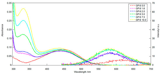 Absorption (left) and emission (right) spectra of RMGP:(6) complex in rising ratios of RMGP.