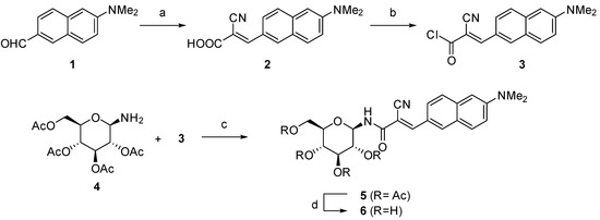The synthesis started with the preparation of known 6-dimethylamino-2-naphthaldehyde (1) from commercially available β-naphthol, following previously published procedures [20,21]. Utilizing the Knoevenagel condensation with cyanoacetic acid [22], aldehyde (1) was transformed into the corresponding acid (2, Scheme 1) in a 90% yield. It was then attempted to couple the acid (2) with 2,3,4,6-tetra-O-acetyl-β-d-glucopyranosylamine (4) [23,24]. Initially, this was done with methodologies utilizing carbodiimide reagents (DCC and EDC), but this approach failed to produce the desired amide. Alternatively, transformation of the acid (2) into the corresponding acid chloride (3), by use of oxalyl chloride, was successful. The crude chloride (3) was then reacted with the amine (4) to yield the desired amide (5) as a component of an inseparable mixture. The crude mixture was directly submitted to deprotection, using methanolic ammonia, to remove the acetyl groups. The final compound (6) was successfully isolated by column chromatography, albeit in moderate 35 % yield, over three steps starting from the acid (2).