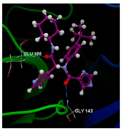 Hydrogen bonds between co-crystallized X77 and GLU 166 and GLY 143 amino acids residues of the binding site of 6W63.