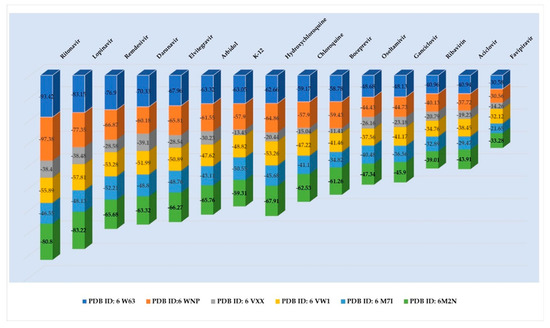 The docking study was carried out with synthetic anti-viral agents (13) and anti-inflammatory agents (2) as ligands against the SARS-CoV-2 main protease (PD ID: 6W63, PD ID: 6WNP), SARS-CoV-2 spike glycoprotein (closed state) (PD ID: 6VXX), SARS-CoV-2 chimeric receptor-binding domain complexed with its receptor human ACE2 (PD ID: 6VW1), SARS-CoV-2 RNA-dependent RNA polymerase (PD ID: 6M71), and SARS-CoV-2 3CL protease (3CL pro) (PD ID: 6M2N).