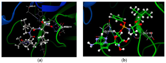 (a). Hydrogen bonds between co-crystallized USG A 101 and GLU 166, CYS 145, SER 144, GLY 143, HIS 141 and HIS 164 amino acids residues of the binding site of 6WNP. (b) Hydrogen bonds between the Remdesivir interacting with the GLU 166 and GLN 189 amino acid residues of the binding site of 6WNP.