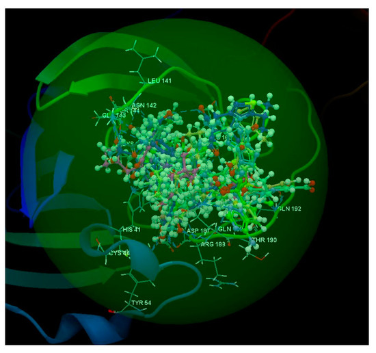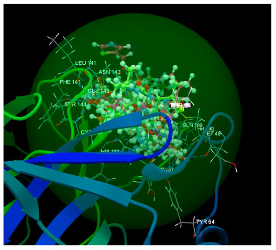 The docking study results reveal that all of the studied ligands were placed in the same binding site (green sphere) of 6VW1 as the co-crystallized NAG 714, and it was observed they have the same orientation as the co-crystallized ligand (Figure 10).