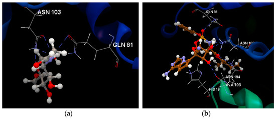 (a). Hydrogen bonds between co-crystallized NAG 714 and ASN 103 and GLN 81 amino acid residues of the binding site of 6VW1. (b) Hydrogen bonds between the Remdesivir interacting with the ASN 103, GLN 81, HIS 195, ALA 193 and ASN 194 amino acids residues of the binding site of 6VW1.