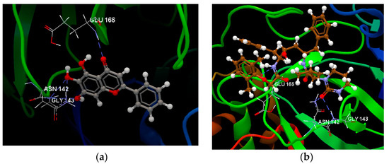 (a) Hydrogen bonds between co-crystallized 3WL A and GLU 166, GLY 143 and ASN 142 amino acids residues of binding. Site of 6M2N. (b) Hydrogen bonds between the Lopinavir ligand interacting with the GLU 166, GLY 143 and ASN 142 amino acid residues of the binding site of 6M2N.