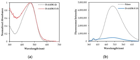 UV/Vis absorption and fluorescence spectroscopy: (a) normalized UV/Vis spectra of peptides 2–3 (1.0 × 10−5 M) at pH 7.5 in phosphate buffer; (b) fluorescence spectra of free Edans and peptide probe 3 (1.0 × 10−5 M) at pH 7.5 in phosphate buffer, upon excitation at 342 nm.