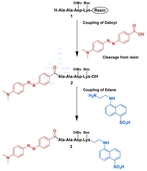 Therefore, the synthesis of the tetrapeptide and the introduction of Dabcyl were obtained by solid phase, while the incorporation of Edans was performed in solution synthesis (Scheme 1). The side chain amino and carboxyl groups of lysine and aspartic acid protected with Boc and OtBu groups, respectively, were maintained during the inclusion of the FRET pair on the peptide to avoid cross-reactions.