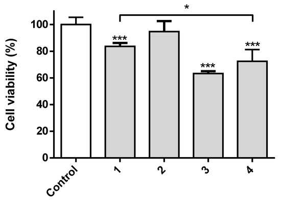Viability of Sf9 cells after exposure to the referred molecules for 24 h at the concentration of 100 µg/mL. * p < 0.05; *** p < 0.001.