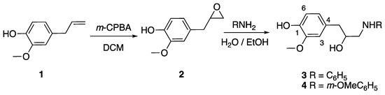 Eugenol, a phenylpropanoid, is a major constituent of clove essential oil with several applications in pharmaceutical, food, agricultural, and cosmetics industries [3], showing various types of biological activities, for example antioxidant [4,5], antimicrobial [6], antiviral [7,8] and anti-inflammatory [9]. Additionally, the ß-amino alcohol moiety represents an important core in the pharmaceutical industry; drugs such as salbutamol and propranolol are amongst the most important therapeutical agents on the market with this feature [10].