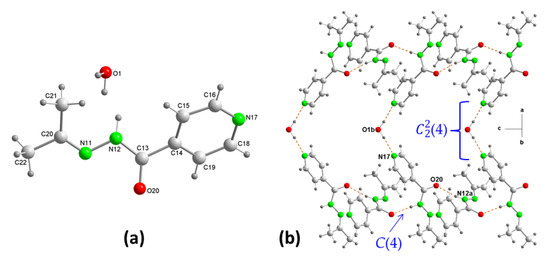 The distances and angles within the pINH were as expected. The crystal structure of (3) showed a substantial change in the pattern and packing of hydrogen bonds with respect to the structures of (1) and (2). The replacement of the two hydrazine hydrogen atoms by the propylidene group removed most of the functionality of the hydrogen bonds of isoniazid. Likewise, the presence of half a molecule of water in the crystalline structure, instead of a COOH group of a carboxylic acid, when this was a coformer in a cocrystal with the modified isoniazid, gave rise to a different packing. The crystal structure consists of a 1D network of C(4) chains formed by homomeric hydrogen bonding of the amide group, i.e., N12–H12A···O20, linking symmetrically related pINH molecules to form chains along the “c” axis (Figure 3b). Such chains have previously been observed in N’-(propan-2-ylidene)isonicotinichydrazide cocrystals with carboxylic acids [18,19]. Furthermore, the characteristic carboxylic acid-pyridine heterosynton of (7) graph-set motif [18,19] that was formed between the COOH group and the N’-(propan-2-ylidene)isonicotinichydrazide molecule in the carboxylic acid cocrystals with the modified isoniazid, in (3) was replaced by a water-pyridine hydrogen bond. Thus, each water molecule acted as a bridge joining two chains of pINH molecules to form a 2D structure parallel to the “ac” plane, where a graphic set (4) was present (Figure 3b).