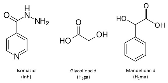 As possible coformers of salts or cocrystals against INH, we considered α-hydroxycarboxylic acids, glycolic (H2ga) and dl-mandelic (H2ma) (Scheme 1) [9,10]. From the point of view of hydrogen bonding, each of them contains three acceptor oxygen atoms and two donor O-H groups. Both participate in many biochemical processes and have widespread applications both in biological systems and in industry. Thus, glycolic acid, a common component of sugarcane juice and other foods, has an important role in photosynthesis and plant respiration, and is a known precursor to oxalate in humans [11]; on the other hand, mandelic acid is a useful precursor to various drugs, for example, homatropine and cyclandelate, which are esters of mandelic acid, and it is also known to have antibacterial properties [12] and has been studied in the preparation of antitumor compounds [13]. Taking into account the previous considerations, the main objective of this work is the design, preparation, and characterization of the physicochemical properties, and the identification of recurrent supramolecular patterns, within a new set of multicomponent pharmaceutical crystals that involve isoniazid with glycolic and dl-mandelic acids as coformers (Scheme 1).