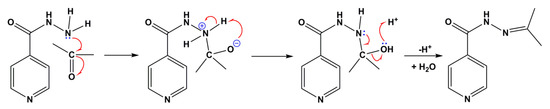 Mechanism for the formation of N’-(propan-2-ylidene)isonicotinichydrazide from isoniazid.