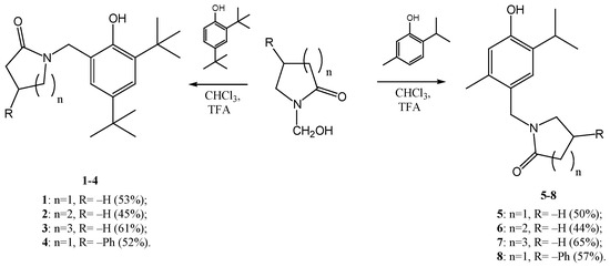 - Vorobyev, S.V.; Primerova, O.V.; Koshelev, V.N.; Ivanova, L.V. Synthesis of alkylphenols lactamomethyl derivatives. Butl. Commun. 2018, 54, 124–131. (In Russian) [Google Scholar]