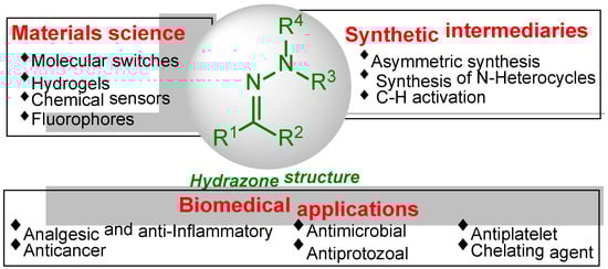 Hydrazones are a class of organic compounds with the structure R1R2C=N–NR3R4 (Figure 1). These prominent compounds have been widely used in the bioconjugation and functionalization of polymers, due to the ease of introducing these functions into biomolecules and probes [1]. Hydrazones have exerted a dominant influence in many other research areas as well. For example, these compounds have been used extensively in materials science for the synthesis of molecular switches [2], hydrogels [3], sensors, and fluorophores [4].