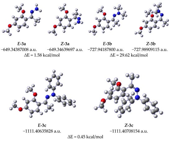 The energy differences between the E and Z isomers found for hydrazones 3a and 3b were 1.58 and 29.62 kcal/mol, respectively. Nevertheless, for hydrazone 3c, the difference was smaller (0.45 kcal/mol). Thus, the density functional theory (DFT) calculations predicted a higher stability for the Z-isomers compared to the corresponding E-isomers, which is in agreement with the NOE experiments performed on acetophenone hydrazones 3a–c [18].