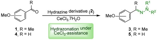 Recently, our group reported the use of oximes as synthetic intermediates for the total synthesis of natural isoquinolines [16,17,18]. The formation of these oximes was carried out through the use of CeCl3.7H2O as an efficient and eco-friendly promoter, as developed by Cortés et al. [19]. Against this background, we have studied CeCl3-assisted hydrazonation of acetophenones and benzaldehydes, in order to explore a new eco-friendly approach to this reaction (Scheme 1).