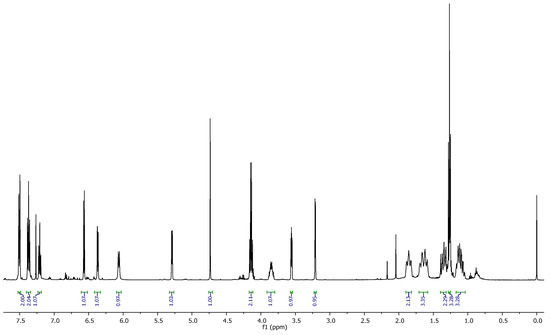 Ethyl 3-(cyclohexylcarbamoyl)-1-oxo-2-phenyl-1,2,3,6,7,7a-hexahydro-3a,6-epoxyisoindole-7-carboxylate 8a Brown solid; Rf = 0.33 (Hexanes-AcOEt = 7/3 V/V); 1H NMR (500 MHz, CDCl3, 25 °C, TMS): δ 7.50 (d, J = 8.0 Hz, 1H), 7.37 (t, J = 8.0 Hz, 1H), 7.21 (t, J = 7.4 Hz, 1H), 6.57 (d, J = 5.9 Hz, 0H), 6.37 (dd, J = 5.9, 1.6 Hz, 0H), 6.06 (d, J = 8.2 Hz, 0H), 5.29 (dd, J = 4.8, 1.6 Hz, 0H), 4.74 (s, 0H), 4.14 (q, J = 7.1 Hz, 1H), 3.92–3.79 (m, 0H), 3.56 (dd, J = 4.8, 3.5 Hz, 0H), 3.21 (d, J = 3.5 Hz, 0H), 1.91–1.79 (m, 1H), 1.73–1.53 (m, 1H), 1.40–1.30 (m, 1H), 1.27 (t, J = 7.1 Hz, 2H), 1.18–1.04 (m, 2H) (Figure 2).