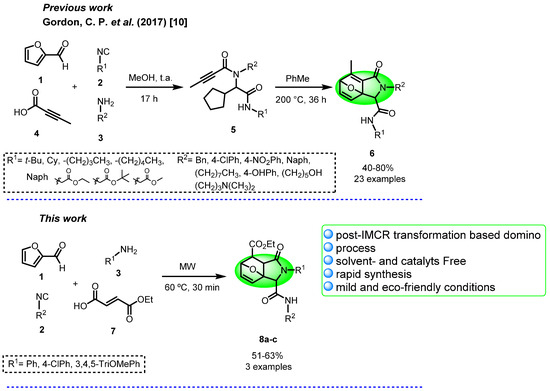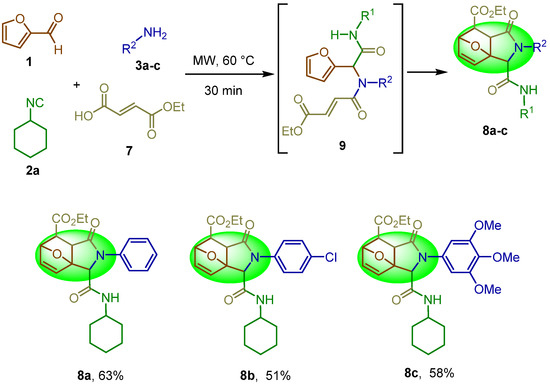 In a previous report, the synthesis of epoxyisoindolinones was performed under drastic conditions, using high temperatures and long reaction times [6]. Our research group is interested in the design and development of green strategies based on I-MCR’s (isocyanide-based multicomponent reactions) toward the synthesis of complex molecules containing several heterocyclic cores. Herein, we describe the microwave-assisted synthesis of epoxyisoindolinones 8a–c from 2-furaldehyde 1, cyclohexyl isocyanide 2a, anilines 3, and fumaric acid monoethyl ester 7 without solvent and a short time of reaction (Scheme 1).