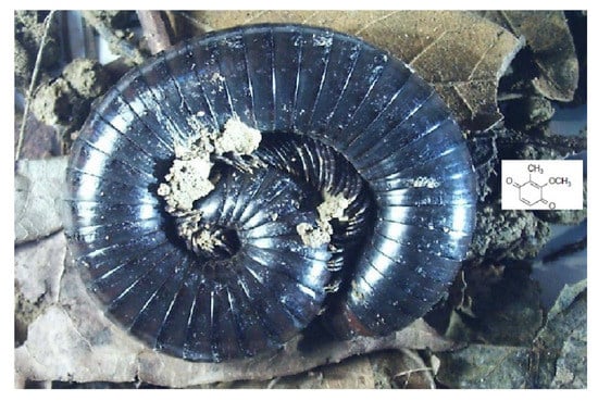- Deml, R.; Huth, A. Benzoquinones and hydroquinones in defensive secretions of tropical millipedes. Naturwissenschaften 2000, 87, 80–82. [Google Scholar] [CrossRef] [PubMed]