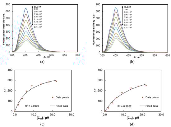 The ability of host 3 to form inclusion complexes with two fullerenes (C60 and C70) was assessed through fluorometric titrations in CH2Cl2 (a solvent choice trade-off between securing a reasonable quantum yield for 3 and solubilizing the fullerenes). The experiments were conducted with the guests in a concentration range of 2.04 × 10−6–2.21 × 10−5 M, while keeping that of the fluorophore constant (6.0 × 10−7 M) (Figure 2). Since both guests display absorption of radiation at the excitation (340 nm) and emission wavelengths (407 nm), correction for h-IFEs was applied (cf. Experimental section for details). Raw titration data for 3 with C60 and C70, and the corresponding curve-fitting plots, are shown in Figure 2.