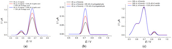 The sensors that were developed were successfully tested on cognac and brandy samples. The phenolic acids and aromatic aldehydes show resolved oxidation peaks on the differential pulse voltammograms for cognac and brandy that is confirmed by the standard addition method (