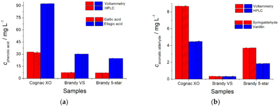 The sensor selectivity in the presence of typical interferences and other natural phenolics was obtained, which is an important advantage. The 1000-fold excess of inorganic ions (K+, Mg2+, Ca2+, NO3‾, Cl‾, and SO42), glucose, rhamnose, and sucrose as well as ascorbic acid (1000- and 100-fold excess in the case of phenolic acids and aromatic aldehydes, respectively) does not show an interference effect. It has been proven that there is an absence of an interference effect caused by syringaldehyde and vanillin (<2.5 and <10 μM, respectively) on the oxidation peaks of phenolic acids. On contrary, gallic and ellagic acid are the major potential causes of interference for the determination of the aromatic aldehydes that are under consideration. A 10-fold excess of gallic acid and <1.0 μM of ellagic acid do not interfere with the determination of vanillin and syringaldehyde. The interference effect of ellagic acid caused by its high concentration in cognac and brandy can be excluded via sample dilution. Thus, the sensors that have been developed here can be applied for the analysis of aged distilled beverages.