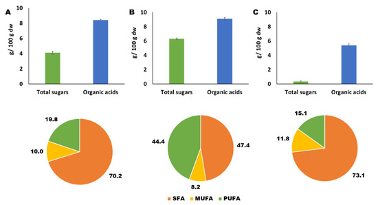 The chemical composition (total sugars, fatty acids, and organic acids) was evaluated following the methodology also described by Barros et al. (2013) [9]. The determinations were performed in duplicate, and the results were expressed as the mean ± SD in g/100 g dw for total sugars and organic acids composition, whereas fatty acids were expressed as the relative percentage of saturated fatty acids (SFAs), monounsaturated fatty acids (MUFAs), and polyunsaturated fatty acids (PUFAs).
