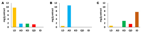 Finally, the results for D. ambrosioides (Figure 3C) showed that this was the only species presenting isorhamnetin derivatives (ID), which were the most abundant compounds in the hydroethanolic extracts (7.58 mg/g extract), and isorhamnetin-3-O-rutinoside were quantified as the main phenolic compound. Additionally, IDs, LDs, KDs, and QDs were also identified in this species in lower concentrations, as well as a lack of ADs (Figure 3C). In previous studies on D. ambrosioides, the highest concentration of phenolic compounds extracted was obtained by methanolic extracts, with 87.7 ± 1.4 µg of gallic acid equivalents/mg extract and 57 ± 1.4 µg quercetin equivalents/mg extract. Moreover, the same authors identified quercetin as the most abundant phenolic compound on D. ambrosioides [18], which is in accordance with our results, since quercetin-O-rhamnosyl-pentoside was the second most abundant compound in the hydroethanolic extracts. This suggests a critical role of solvent on the extraction of phenolic compounds from Amaranthaceae plants.
