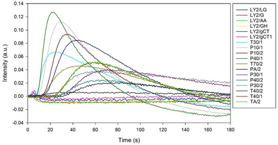 The typical output from the FOX 4000 eNose is shown in Figure 1, where each curve represents the response of a sensor to a BC urine sample. Here, the sensor response is defined as intensity, which is the change in resistance from the baseline divided by the baseline resistance.