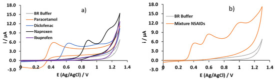 The electrochemical study of the NSAIDs was carried out by CV in a solution of 4 × 10−4 mol·L−1 of the drug standards, in BR buffer at pH 7 (Figure 1a). In the window from 0 to 1.3 V in the first sweep in the anodic direction, the oxidation peak corresponding to paracetamol, diclofenac, at a potential of 0.446 and 0.629, respectively, was observed. Naproxen presented two oxidation peaks at a potential of 0.888 and 1.14 V. In the case of ibuprofen, no anodic signal was observed, but the baseline was modified compared to the blank, so we believe that if it is carried out by the oxidation of the drug. Reversing the sweep in the cathodic direction, only one reduction peak was observed with a maximum peak potential at 0.263 V, which corresponds to the reduction of paracetamol. Moreover, a CV was performed in a mixture of the five NSAIDS and the BR Buffer (blank) using the proposed working electrode (Figure 1b), under the same conditions of the systems shown in Figure 1a. In Figure 1b, only three oxidation peaks can be observed in the anodic sense, since some signals overlap in the drugs, and it should also be noted that in the cathodic sweep the reduction signal of paracetamol is not observed, and this could be because the product that was reduced reacted chemically with some oxidation products of the other drugs and the product is no longer electroactive in reduction.