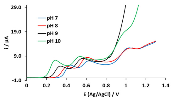 CVs obtained for the NSAIDs mixture at different pHs (range of 7–10) in a 0.1 mol·L−1 BR buffer, using a potential window of 0 to 1.3 V and a scan rate of 100 mV·s−1, and a concentration of 4 × 10−4 mol·L−1 for the NSAIDs.