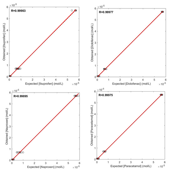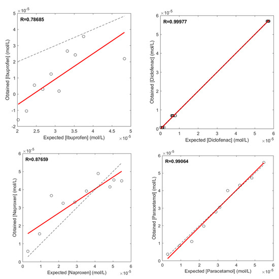 Using the optimal parameters of the DPV to analyze the 27 samples considering different concentrations of the NSAIDs, and they were performed using a 35−2 fractional facto-rial design. The trained MLP was used to determine the performance in the quantification task of drugs and the relationship between the concentrations obtained and those expected was evaluated, both for the training and the test phases. In this sense, the linear regression obtained from the comparison was a measure of the model’s goodness. Given ideal conditions, the line must have a slope equal to 1 and its intersection equal to 0. The comparative graphs between the real concentrations of paracetamol, diclofenac, naproxen, and ibuprofen and those predicted with the MLP model for the training and test data set (Figure 3 and Figure 4, respectively). The high level of linearity allows a linear regression coefficient of the data obtained very close to one (R = 0.98) for paracetamol and diclofenac, while for the naproxen and ibuprofen, the correlation value was 0.87 and 0.78 respectively; aspirin was present as an interfering agent in the mixture.