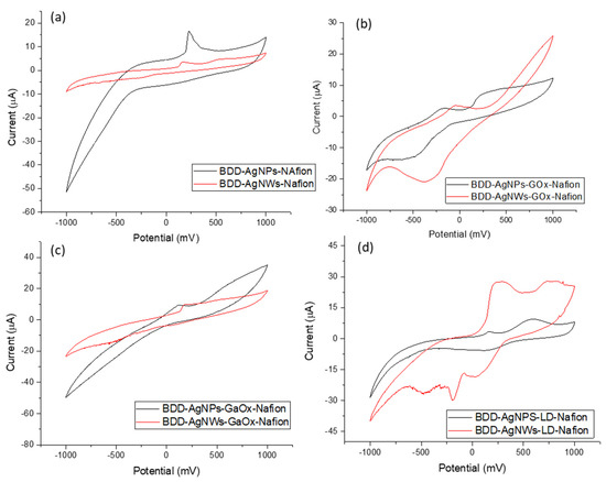 Electrochemical response of the sensors of AgNPs bioET (black) and AgNWs bioET (red) in a 50% diluted Classical Whole Milk in 0.1 M KCl solution, (a) sensors formed without enzyme, (b) biosensors with glucose oxidase immobilized, (c) biosensors with galactose oxidase immobilized and (d) biosensors with lactate dehydrogenase immobilized.