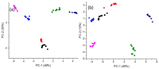 PCA score-plot analyzed using a 4 sensors array (a) AgNWs bioET or (b) AgNPs bioET, of the 6 milks of different fat content and nutritional characteristics: Classical Skimmed (black), Classical Skimmed Lactose free (red), Classical Whole (blue), Classical Whole Lactose free (pink), Classical Semi Skimmed (green) and Classical Semi Skimmed Lactose free (dark blue).