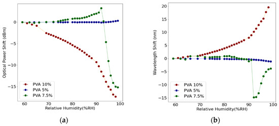 Figure 4 shows the optical power and wavelength shifts in varying humidity for the cases of the PEG-coated LPFGs. In this case, the transition associated with the external medium having n > nclad is seen in all cases, and at lower RH values than PVA (80 to 87%RH), as can be seen in Figure 4b. This result was to be expected, given that the RI of PEG is lower than that of PVA, ranging from around 1.44 to 1.413 in the range of 60 to 99%RH (in the Sodium line) [8], meaning that the transition will happen at lower RH values. This renders the sensors not suitable in wavelength shift response, even though their optical power shift response (Figure 3a) could be used, in the 80 to 95%RH in the case of the 75% wt/wt coated LPFG.