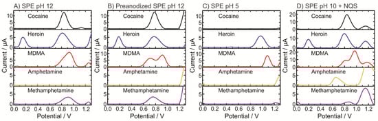 Electrochemical profiles of illicit drugs (0.5 mM) obtained by square-wave voltammetry (SWV) using SPE at different pH: (A) pH 12; (B) pH 12 using preanodized SPE; (C) pH 5; and (D) pH 10 including the derivatizing agent NQS.
