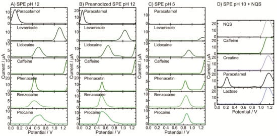 A similar electrochemical approach was performed employing the most encountered cutting agents (i.e., paracetamol, levamisole, lidocaine, caffeine, phenacetin, benzocaine, procaine and lactose [12,14,16]) (Figure 2A–D). Particularly interesting is the effect of the anodic pretreatment on the paracetamol signal exhibiting a sharper oxidation peak (Figure 2B). This permits the proper identification of the 6-MAM peak, thus avoiding peak overlap [12]. Besides, the effect of pH on the electrochemical signal showed a pH dependence as the oxidation peak shifts towards higher potentials at acidic pHs (Figure 2C). As pH 10 with NQS is targeted for the detection of amphetamine, only common cutting agents encountered in amphetamine real samples are explored (Figure 2D). Considering the profiling of the cutting agents, most of the peak potentials do not fall in the same position as the illicit drugs, thus allowing for a suitable identification in real samples.