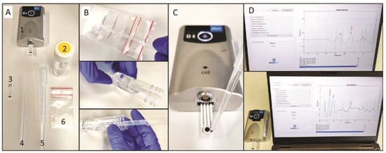 On-site detection of illicit drugs with the portable electrochemical device. (A) Elements of the electrochemical device (1—potentiostat, 2—buffer container, 3—SPE, 4—disposable spatula, 5—disposable pipette, 6—confiscated sample); (B) Sampling procedure; (C) deposition of the solution on the setup ready for the electrochemical interrogation and (D) user-friendly interface showing the results of the analysis.