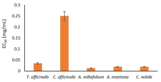 - Vidic, D.; Ćavar Zeljković, S.; Dizdar, M.; Maksimović, M. Essential oil composition and antioxidant activity of four Asteraceae species from Bosnia. J. Essent. Oil Res. 2016, 28, 445–457. [Google Scholar] [CrossRef]