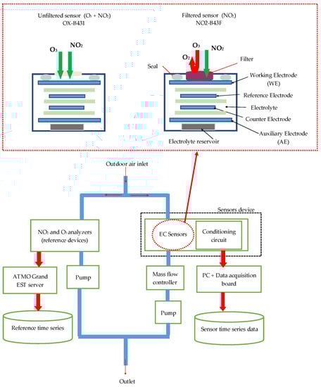 In this work, we focused on measuring the concentration of O3 and NO2 in ambient air because they are the principal pollutant gases in French cities that are still exceeding the limited values defined by the European directives [7]. Therefore, we designed a device constituted of two electrochemical sensors provided by Alphasense LTD—NO2-B41F and OX-B431—dedicated to measure NO2 and oxidizing gases, respectively. The device also contains the sensors’ conditioning circuits, the gas exposure chamber, and the data acquisition unit. The conditioning circuits consist of potentiostat circuits that allow amplifying and converting the sensor electrode currents to voltages. The device is placed inside the air monitoring station managed by ATMO Grand Est agency. This station is located beside a highway, crossing Metz city, France. Our device works in dynamic mode for air sampling; thus, a pump and a mass flow controller are placed on the exposure chamber exit to generate a constant and continuous airflow by suction (Figure 1). We set the airflow rate to 500 mL/min, in order to obtain the same airflow rate as the ATMO Grand Est O3 and NO2 analyzers. The collected data represent the voltages of the sensor responses with a data sampling frequency of 200 Hz. Sensor responses are then averaged over a period of 10 s and recorded on a computer using Matlab software. Finally, recorded data are averaged again every 15 min in order to comply with the reference data provided by ATMO Grand Est. Data are collected continuously from 22 February 2019 to 14 April 2019.