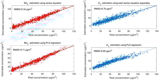 The comparison between calibration of each sensor individually and the combination of the two sensors’ signals with temperature and humidity variation using PLS regression shows that the concentration estimation is better in the case of using PLS regression than the case of calibrating each sensor individually. Figure 2 illustrates that in the case of using PLS regression, the root-mean-square errors (RMSE) are 4.71 µg/m3 and 6.89 µg/m3 for NO2 and O3, respectively, whereas in the case of using each sensor individually, the RMSE values were 6.34 µg/m3 and 8.76 µg/m3, respectively. We note also that the estimation of NO2 is better than the estimation of O3 in both calibration cases. The reason behind this is that NO2 estimation depends essentially on one sensor, whereas the estimation of O3 depends on both sensors.
