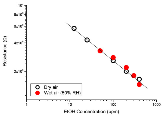 From the above test, the calibration curve shown in Figure 3 was obtained. Plotting the data in a log–log graph, a high linear correlation between the sensor resistance and the ethanol concentration is observed. The same graph also shows the calibration curve for the same sensor obtained in conditions of higher relative humidity (50% RH). Breath is highly saturated with water vapor; therefore, the sensor performance must not be influenced by changes in the humidity level [11,12,13]. Interestingly, the sensor signal that we collected in different humidity conditions appears to be independent of this variable.
