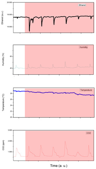Signals from the ethanol, humidity, temperature and CO2 sensors, recorded before drinking alcoholic beverages (white zone, left column) and subsequently after drinking an alcoholic beverage (red zone, right column).