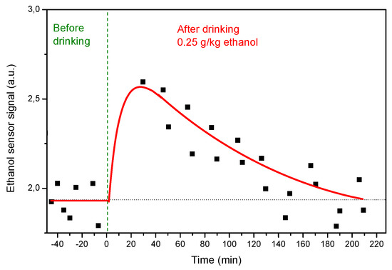 By analyzing data coming from the ethanol sensor, we can see that after the alcoholic beverage is consumed, the signal of the sensor undergoes a quick increase, reaching a maximum after about 30 min (see Figure 6). Subsequently, the signal of the ethanol sensor tends to decrease, as expected by considering the well-known dynamic process of ethanol absorption, metabolism and elimination from the body after its ingestion [17].