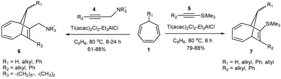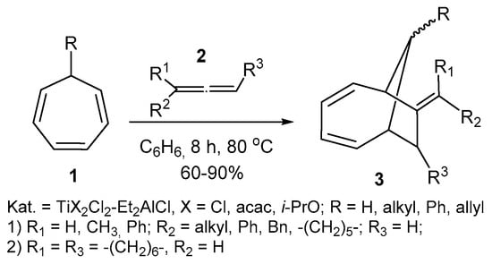 - D’yakonov, V.A.; Kadikova, G.N.; Kolokoltsev, D.I.; Ramazanov, I.R.; Dzhemilev, U.M. Titanium-Catalyzed [6π+2π]-Cycloaddition of Alkynes and Allenes to 7-Substituted 1,3,5-Cycloheptatrienes. Eur. J. Org. Chem. 2015, 2015, 4464–4470. [Google Scholar] [CrossRef]
