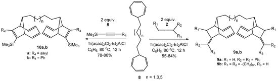 - Dyakonov, V.A.; Kadikova, G.N.; Nasretdinov, R.N.; Kolokoltsev, D.I.; Dzhemilev, U.M. Titanium-catalyzed [6π+2π]-cycloaddition of Si-containing alkynes to bis(1,3,5-cycloheptatriene-7-yl)alkanes. Tetrahedron Lett. 2017, 58, 1714–1716. [Google Scholar] [CrossRef]