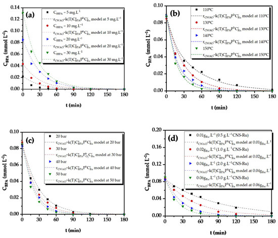 Fitted experimental data to Equation (6) for (a) different initial BPA concentrations in the reaction (130 °C, 20 bar, 2.0 g L−1 of CNS−Ru(2%); (b) different reaction temperatures (20 bar, 2.0 g L−1 of CNS−Ru(2%), C0BPA = 20 mg L−1); (c) different pressures (130 °C, C0BPA = 20 mg L−1, 2.0 g L−1 CNS−Ru); (d) different Ru concentration values (130 °C, 20 bar, C0BPA = 20 mg L−1).