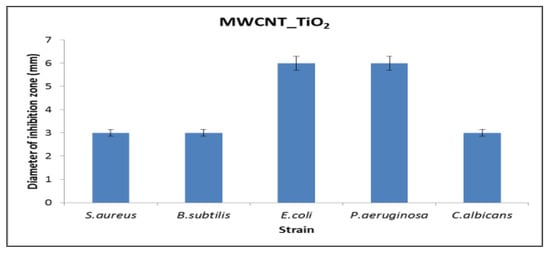 Worldwide, one of the most significant threats to human health problems remains antibiotic resistance. In the last several years, bacteria have evolved in order to survive antimicrobial treatments by effectively developing resistance mechanisms []. It has been shown that nanoparticles and nanotubes have outstanding antimicrobial activity due to the increased contact area with bacteria []. The aim of this study was to design and characterize hybrid materials composed by multi-walled carbon nanotubes (MWCNTs) decorated with TiO2 nanoparticles, in order to obtain an efficient nanosystem with improved antimicrobial activity by a fast and low-cost method. The carbon nanotubes used in this study were obtained by chemical synthesis [] and used as a template for TiO2 nanoparticles formation. The nanocomposites (MWCNTs_TiO2) were obtained by TiO2 in situ attachment on the surface of MWCNTs, by using a titanium (IV) isopropoxide precursor. The obtained hybrid nanomaterials were further characterized by Raman Spectroscopy Analysis, X-ray Diffraction Analysis (XRD), and Transmission Electron Microscopy (TEM). The antimicrobial activity of MWCNTs_TiO2 was investigated against two Gram-positive (Staphylococcus aureus, Bacillus subtilis), two Gram-negative (Pseudomonas aeruginosa, Escherichia coli) and one yeast (Candida albicans) to cover the most important model opportunistic pathogens. TEM micrographs revealed that the MWCNTs have a diameter between 9 and 50 nm and a length of 600 nm and TiO2 nanoparticles with a diameter of about 15 nm were successful deposited on the nanotubes surface. Qualitative testing of antimicrobial activity demonstrated that MWCNT_TiO2 were able to inhibit growth for all tested strains, mostly in the case of the Gram-negative bacteria (E. coli and P. aeruginosa). Quantitative tests showed that the obtained nanocomposites have more pronounced antimicrobial effects on Gram-negative bacteria compared to the yeast or Gram-positive bacteria. This can be explained with the particularities of the cellular wall of each type of bacteria, Gram-negative bacteria have a thin peptidoglycan layer and an outer lipid membrane, which make the bacteria easier to inhibit and leads to a faster destructibility of the cell membrane. The decoration of MWCNTs with TiO2 nanoparticles has been successful carry out, spherical nanoparticles with a diameter about 15 nm being attached to the nanotubes surface. The obtained nanocomposites presented more pronounced antimicrobial activity on Gram-negative bacteria. The obtained results sustained that the synthetized nanocomposites can be considered as competitive candidates for the development of efficient antimicrobial systems (Figure 1).